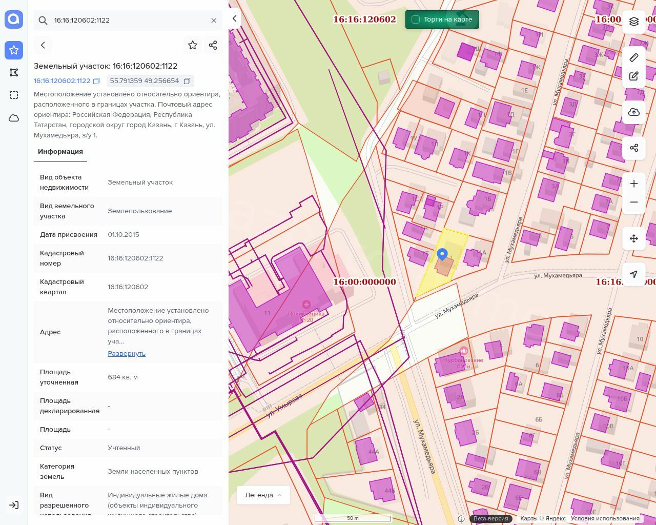 2) Земельный участок, общая площадь 684 кв.м., кадастровый номер 16:16:120602:1122,