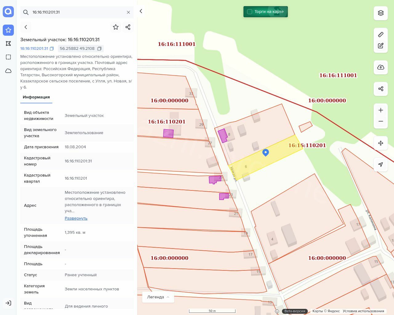 Земельный участок для ведения личного подсобного хозяйства, площадь 1395+/-26 м2, кадастровый номер 16:16:110201:31
