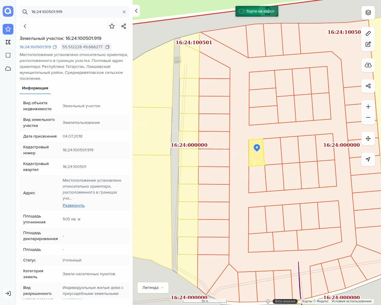 Лот №1. Земельный участок, общая площадь: 505 кв.м. +/- 8,0 кв.м.; кадастровый номер: 16:24:100501:919