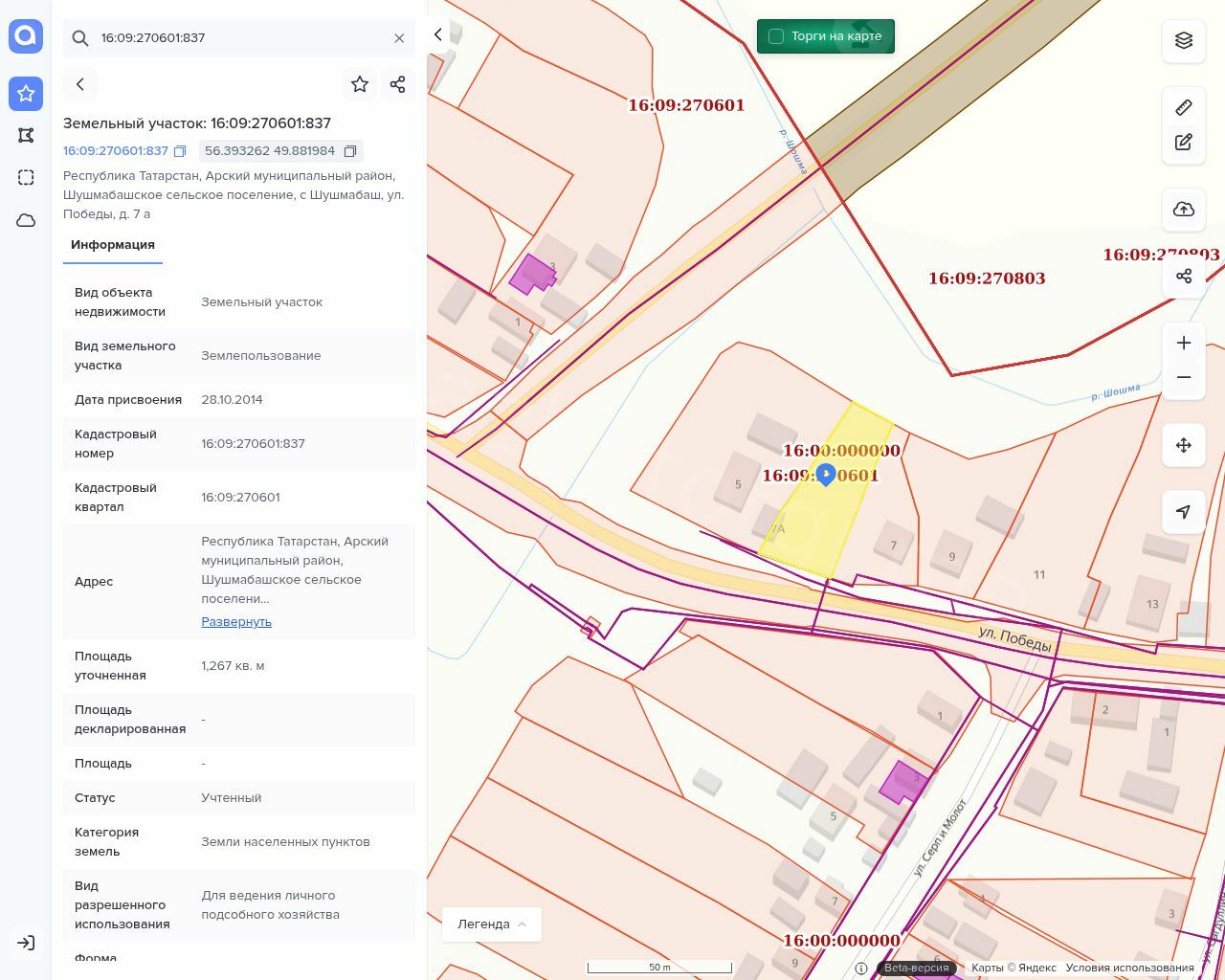 Земельный участок, кадастровый номер: 16:09:270601:837, площадь 1267 +/- 12 кв. м., категория земель: Земли населенных пунктов, виды разрешенного использования объекта недвижимости: Для ведения личного подсобного хозяйства